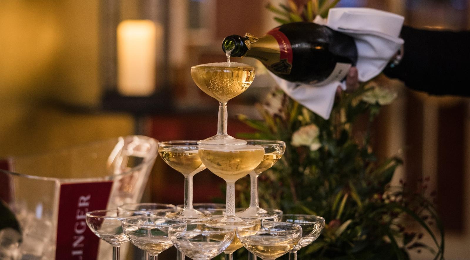 Samppanjatornin kaato ja livemusiikki klo 17 alkaen.