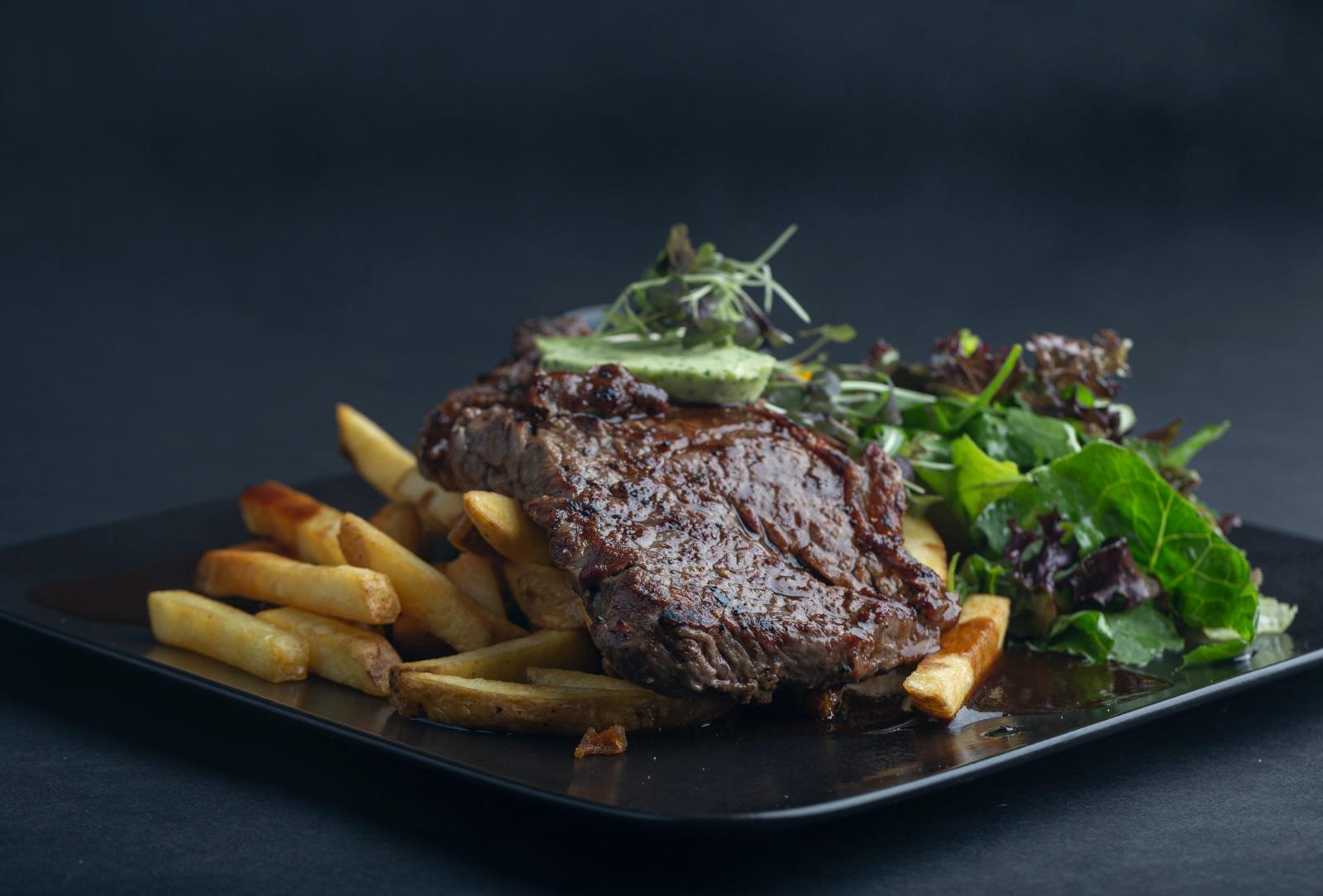 Charcoal-grilled beef rib-eye steak 250g served with a chimihurri, lemon and parmesan aioli and French fries.