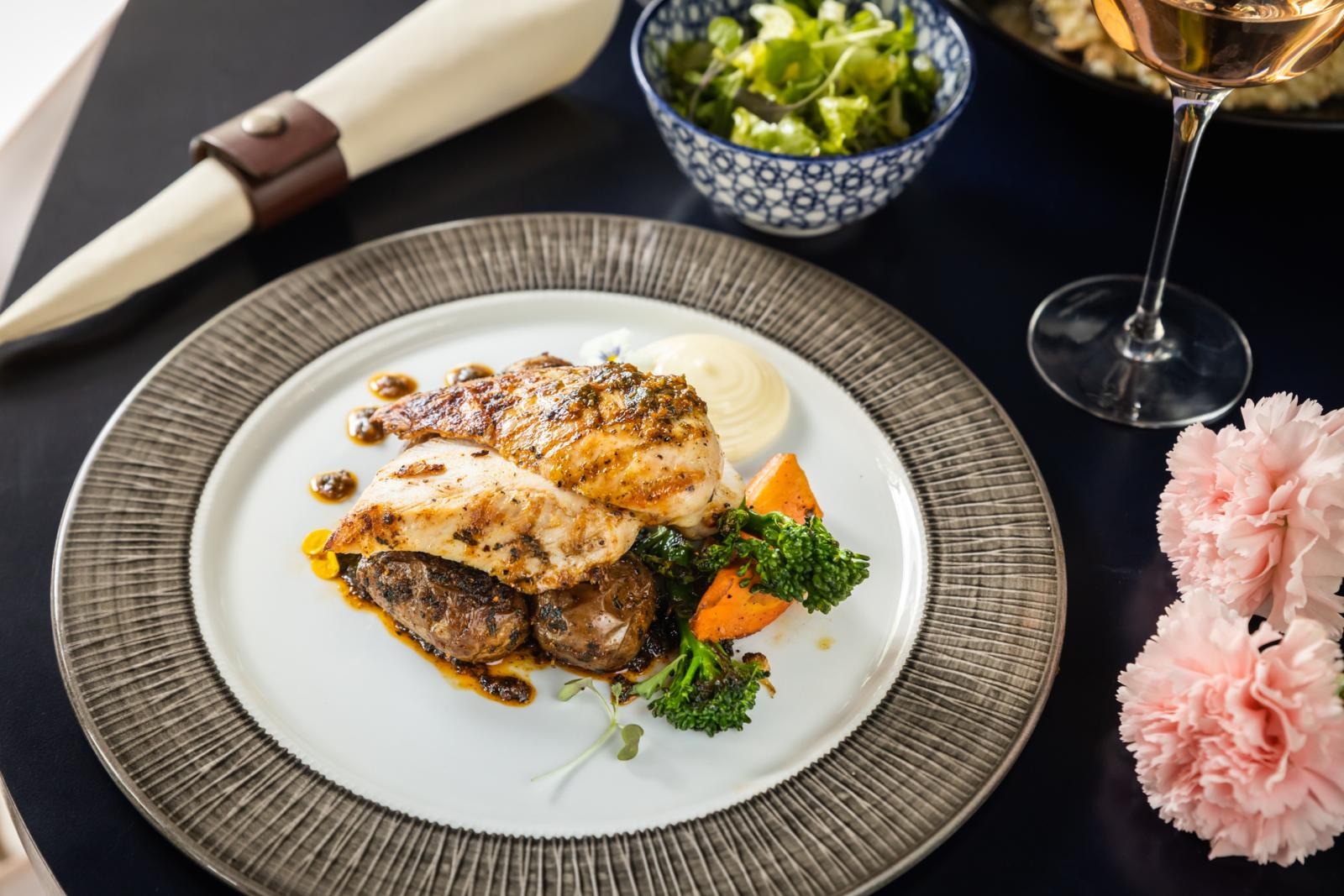 Charcoal-grilled chicken, raspberry and red wine sauce, parmesan cream and grilled herb potatoes.