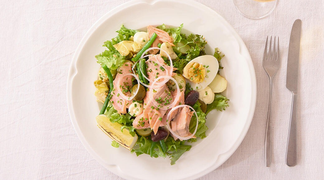 Hot-smoked salmon, greens seasoned with vinaigrette sauce, pickled artichoke, French potato salad, olives, beans, egg, shallots and aioli
