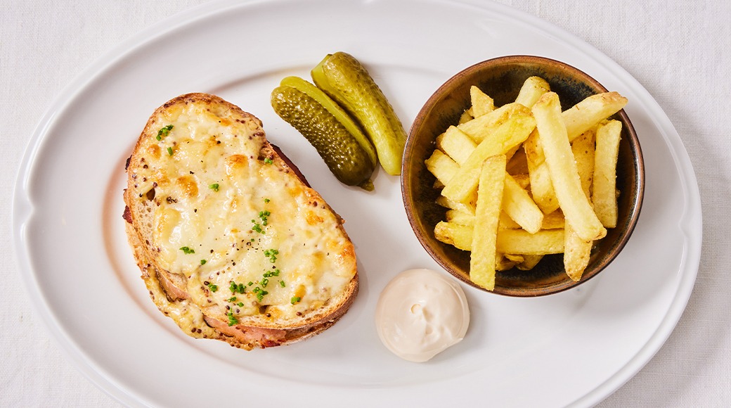 Les plats principaux [main courses] Les plats principaux [main courses] Warm house ham and cheese sandwich, smoked country-style ham, dijonnaise, Comté cheese. Served with French fries and aioli.