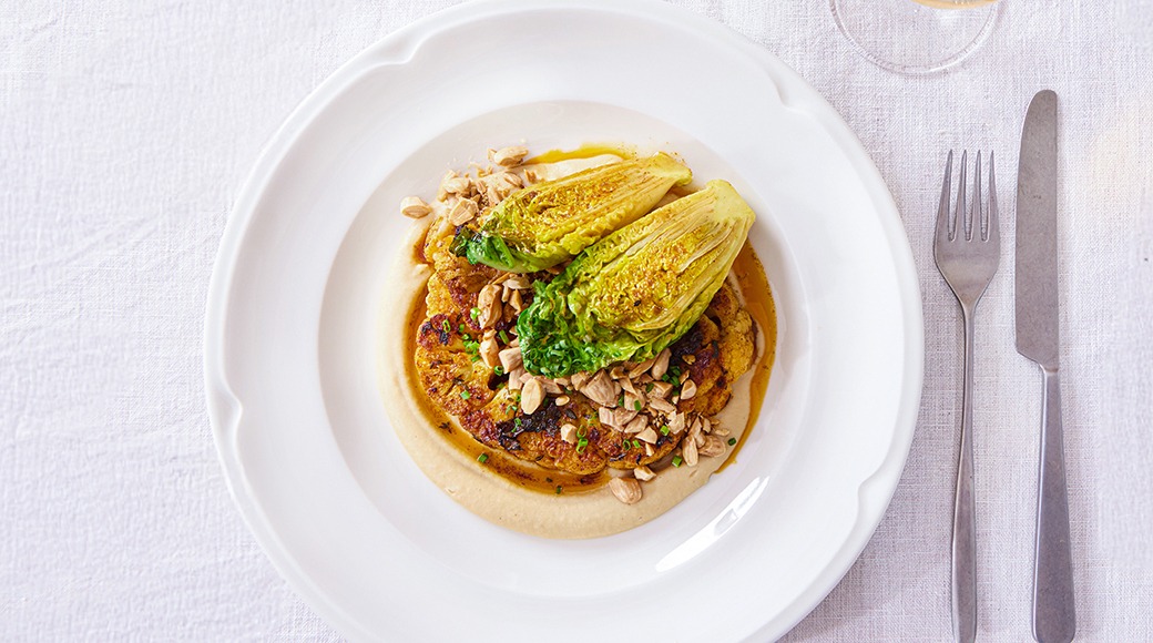 Roasted cauliflower and almonds, bean purée, baby gem lettuce and vinaigrette