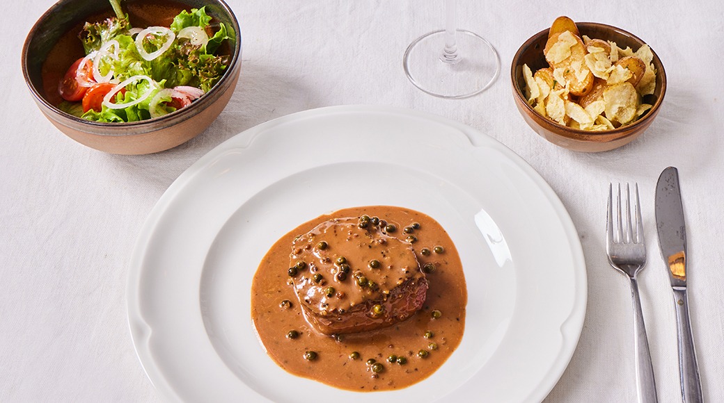 Fillet of beef roasted with pepper, creamy pepper sauce and pickled green peppercorn. Served with creamy garlic potatoes and a green salad seasoned with vinaigrette sauce.