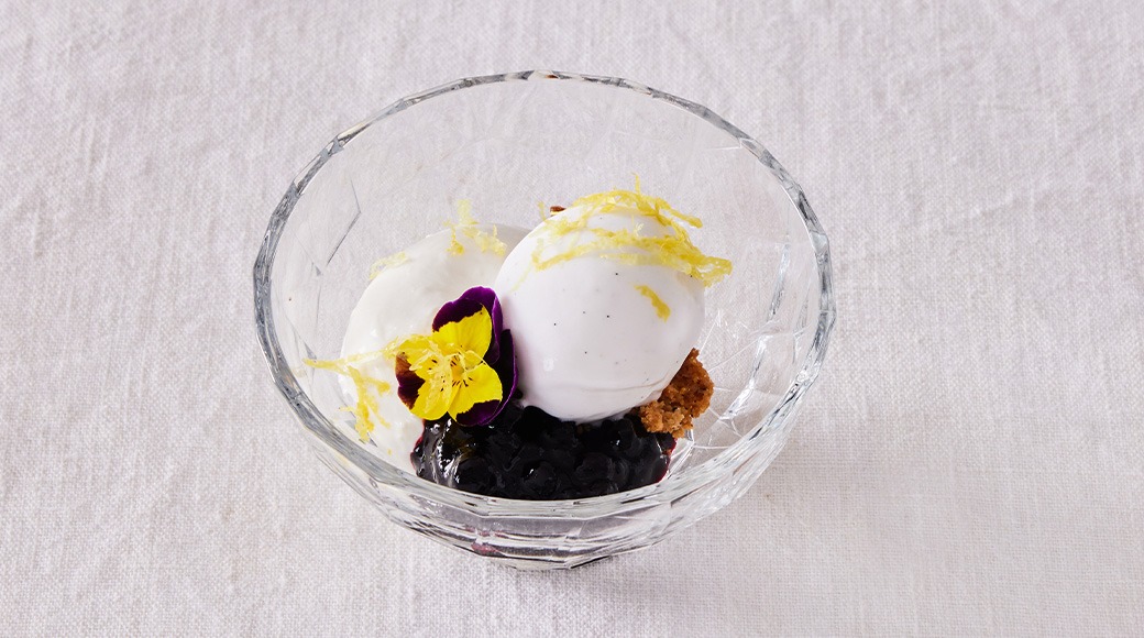 Lemon-flavoured vegan cream cheese cream, blueberry compote, cardamom crumble and vanilla ice cream.