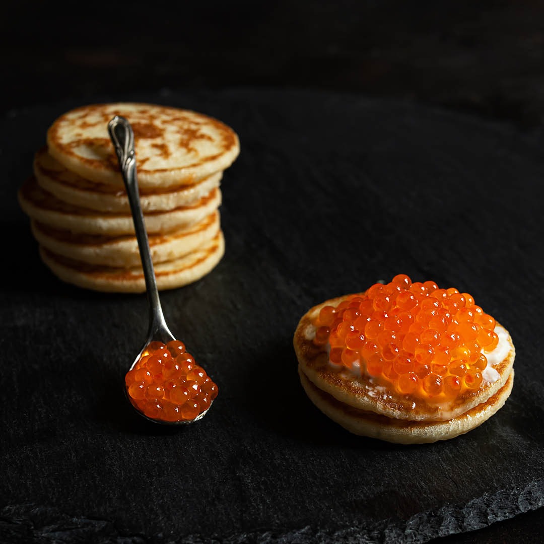 Puiston omalla reseptillä valmistettuja, voissa paistettuja herkullisia blinejä valitsemillasi lisukkeilla.