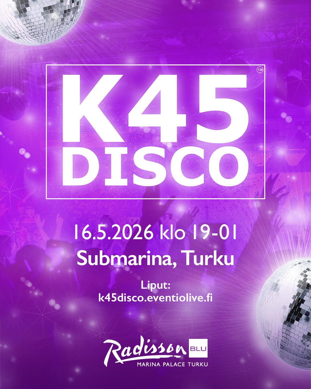 Suuren suosion saavuttaneet Marinan K-45 Discot saavat jatkoa keväällä 2026. Klassikko discobiisit, tanssilattia ja hyvä tunnelma takaavat hauskan illan aikuisille. Ovet ja baari avataan klo 19.00.