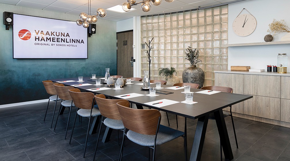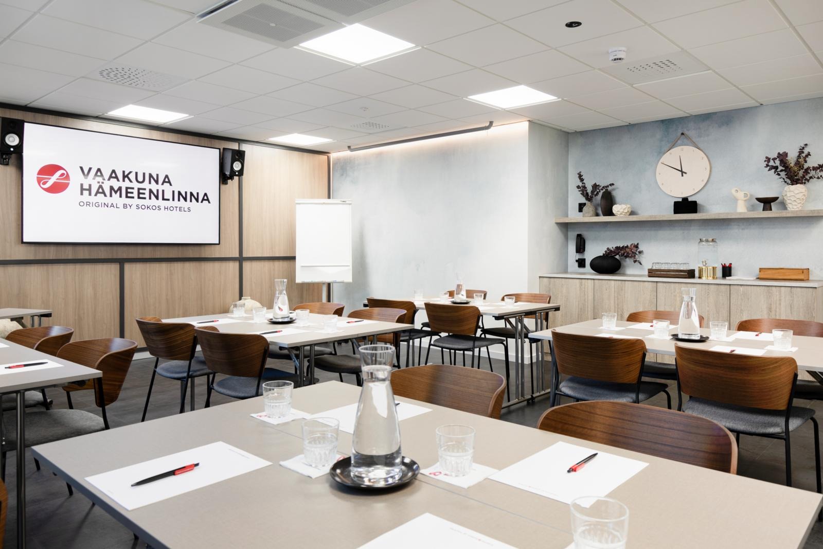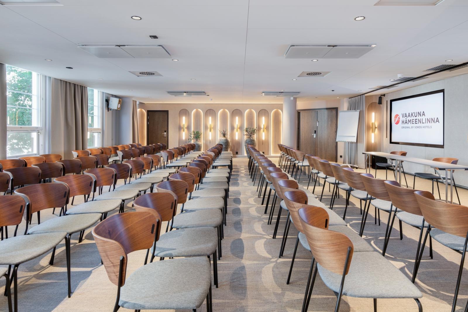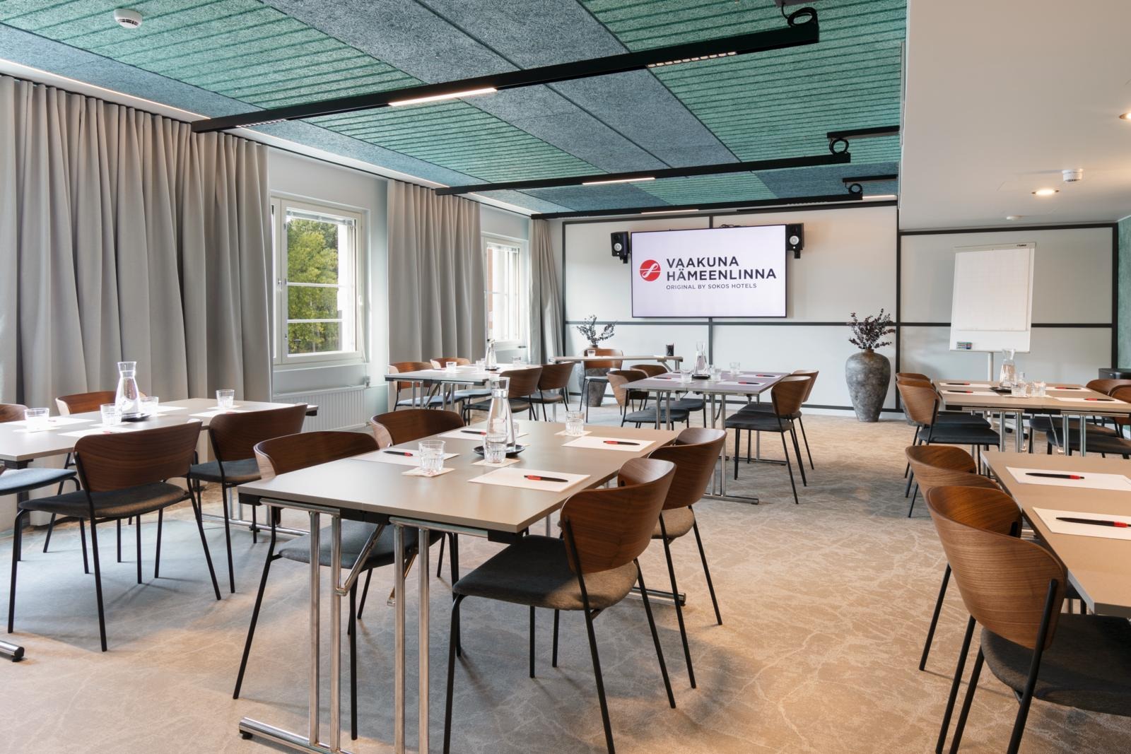 Täysin uudistettu Vaakuna-sali on mitä tunnelmallisin kokous- ja juhlatila jopa sadalle henkilölle. Ikkunallinen ja jäähdytetty, värimaailmaltaan huolellisesti harkittu tila tarjoaa upeat puitteet niin luovaan kokoustamiseen kuin rennompaan yhdessäoloon.