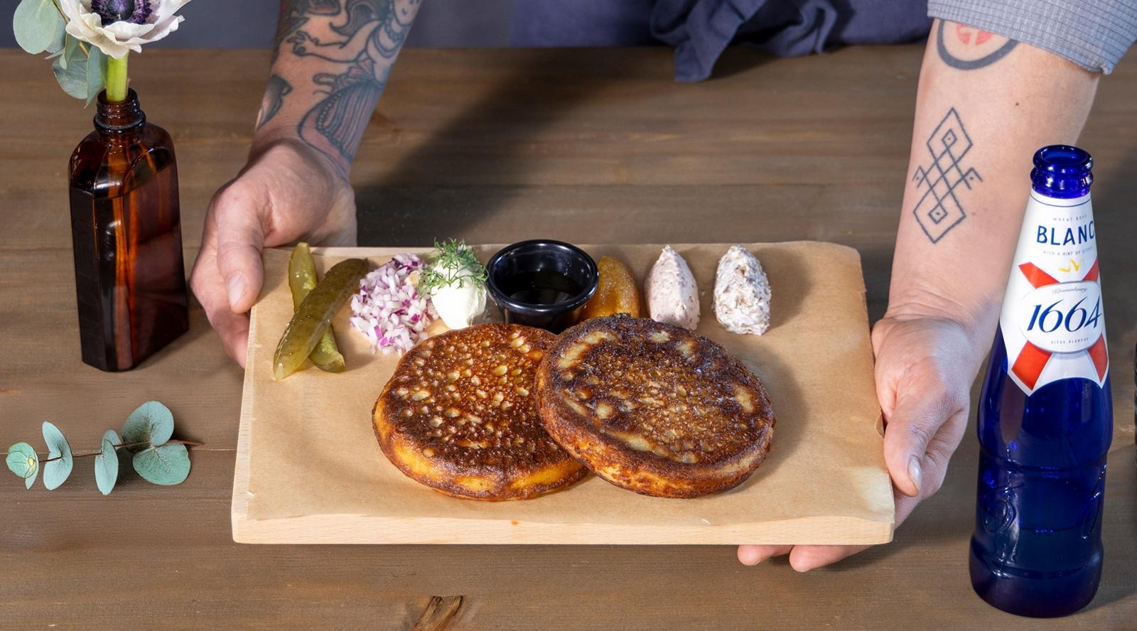 1664 Blanc -vehnäolut sopii blinien kanssa erityisen hyvin, koska sen hedelmäinen ja sitruksinen makuprofiili tuo raikkautta ja keveyttä, jotka tasapainottavat blinien täytteiden, kuten mädin ja smetanan, suolaisuutta ja täyteläisyyttä.