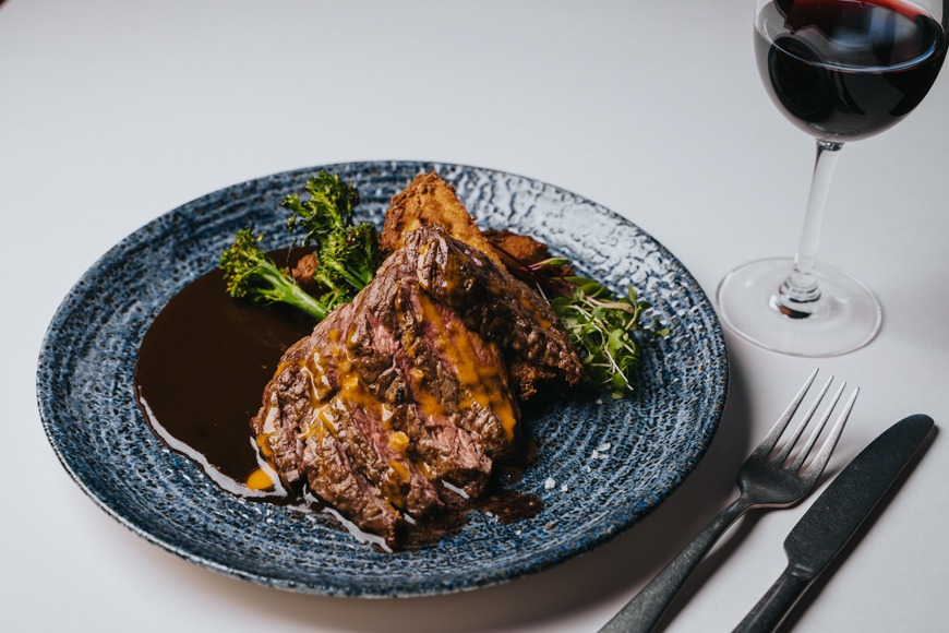 Grillattua naudan kuvepaistia, röstiperunaa, broccoliinia ja tummaa minttukastiketta
