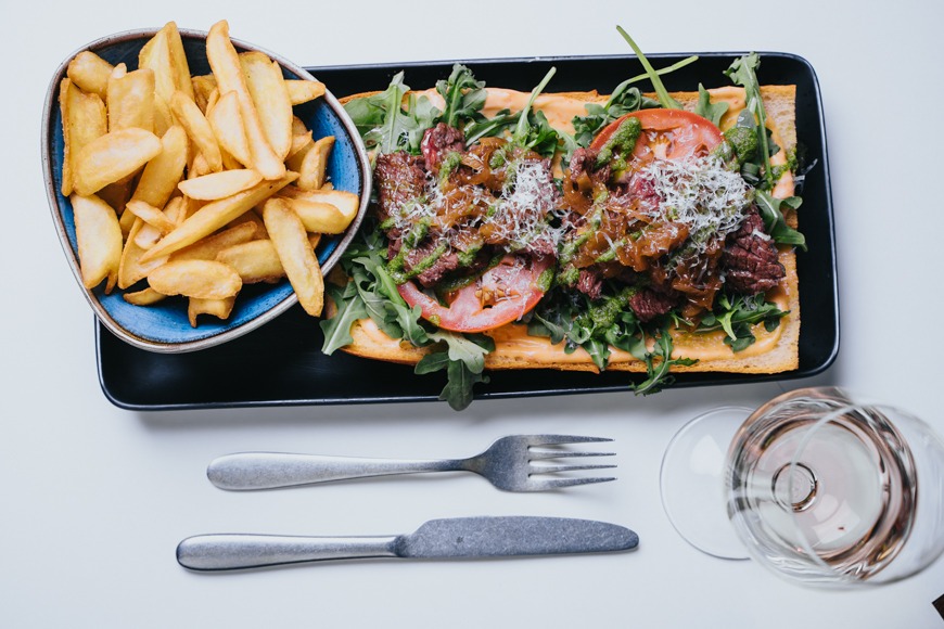 Voissa paahdetun Jyväspakarin cheddarpatongin päällä grillattua härkää, Jukolan Juuston Aito Cheddaria, rucolaa, karamellisoitua sipulia, pihvitomaattia, jalapeno-chilimajoneesia, salsa verdeä ja parmesanjuustoa.