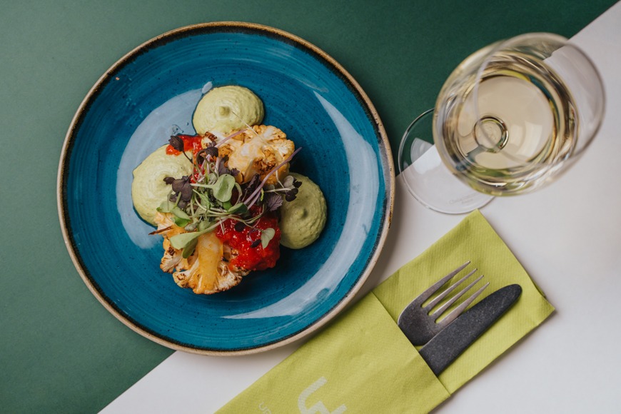 Grillattua kukkakaalia, sweet chiliä, yrttistä hummusta ja paprikahilloa
