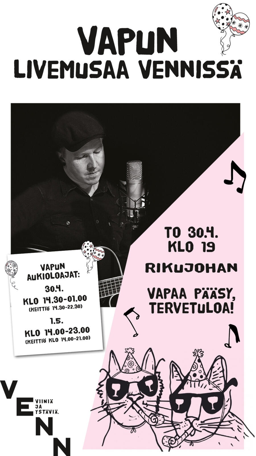 Kippis vapulle! Tervetuloa kippistelemään vappua mein kanssa. VENNin vappustagella livemusasta vastaa RikuJohan klo19!