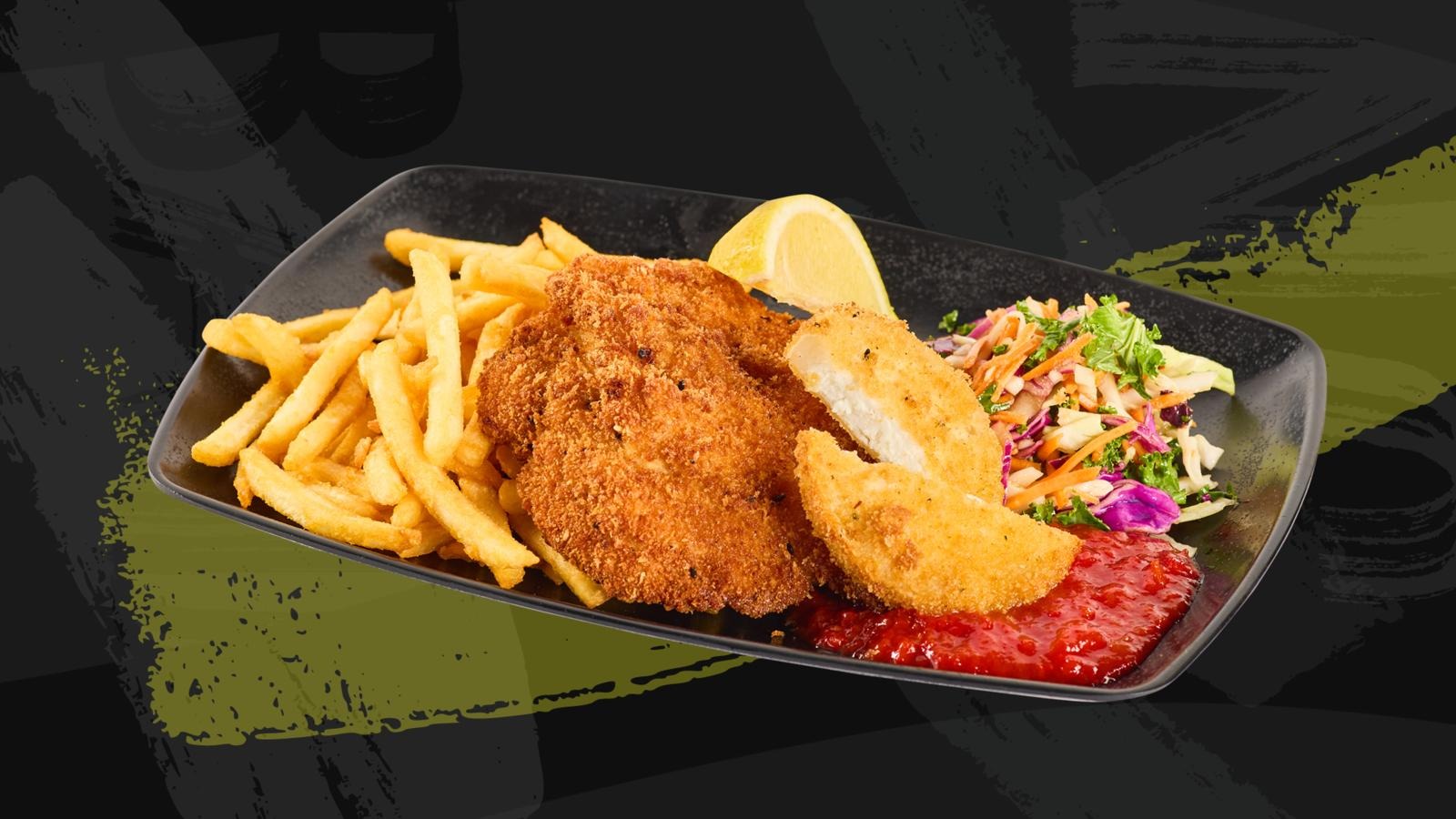 Rapea Tsikenin fileeleike, paneroitua vuohenjuustoa, paholaisenhilloa, raikasta salaattia ja ranskalaisia perunoita