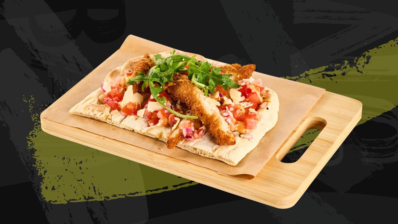 Paahdettu italialainen Pinsa-leipä, rapeaa Tsikenin kanaa, crème fraîchea, tomaatti-chilikastiketta, tuoretomaattisalsaa, rucolaa, parmesanjuustoa ja ranskalaisia perunoita