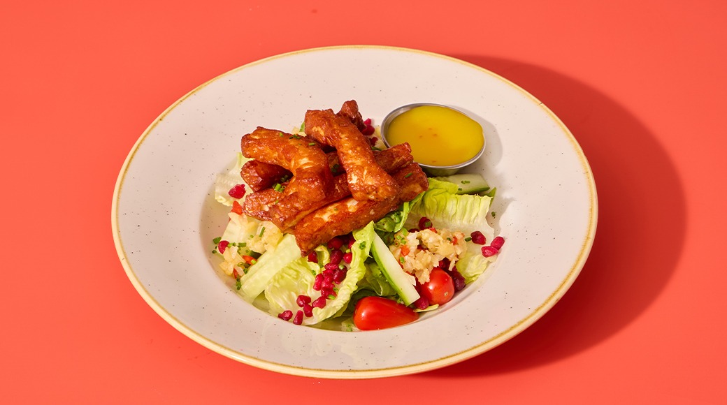 Värske salat ja passionivinegrett tomati, kurgi, ananassisalsa, granaatõunaseemnete, friteeritud halloumi ja mangokastmega