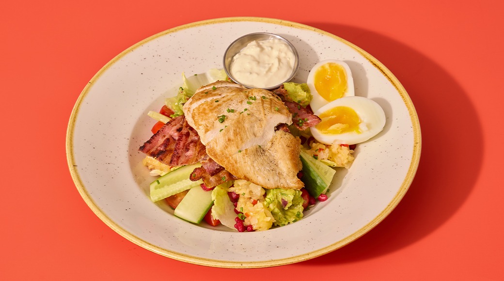 Salads Salads Värske salat ja passionivinegrett tomati, kurgi, granaatõunaseemnete, ananassisalsa, peekoni, grillitud broileri, kanamuna, guacamole ja Blue Cheese-kastmega