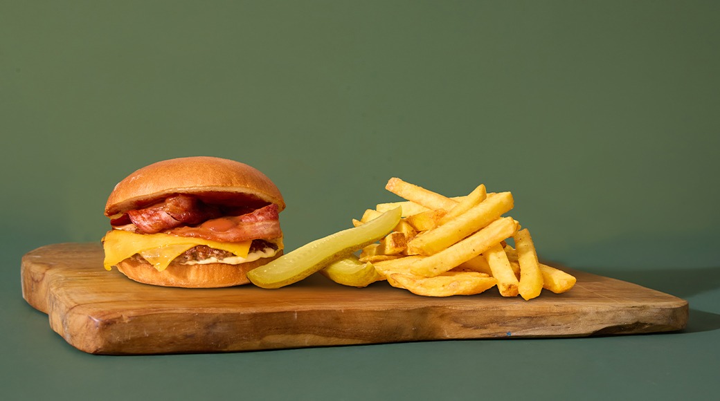Brioss-kukkel, burgeripihv, peekon, cheddar, Dijoni majonees, majaketšup ja soolakurgid; serveeritakse friikartulitega