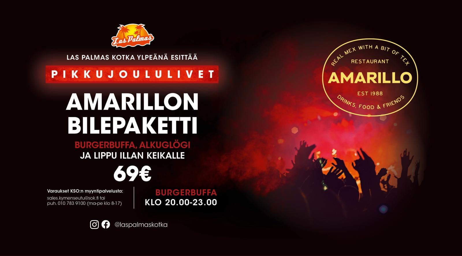 Juomaa, ruokaa, hyvää fiilistä sekä Suomen eturivin artistin keikka yhden oven takana. Tule juhlimaan Pikkujouluja Amarillon ja Las Palmasin auringon alle. Bilepakettiin kuuluu alkuglögi, Amarillon maukas Burgerbuffa ja lippu illan keikalle. Burgerbuffa katettuna klo 20.00-23.00, jonka jälkeen suunnataan tanssilattialle seuraavien artistien tahtiin;