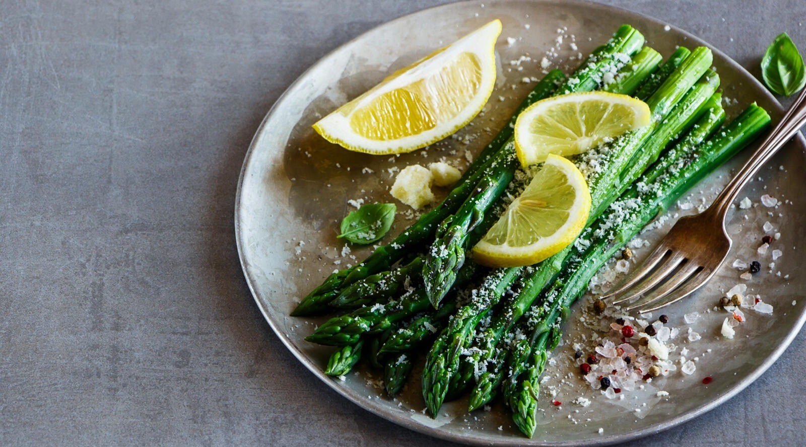 Vihreää parsaa haarukassa valkoisen lautasen yläpuolella, jolla on salaattia lohesta, parsasta ja mikroyrteistä.