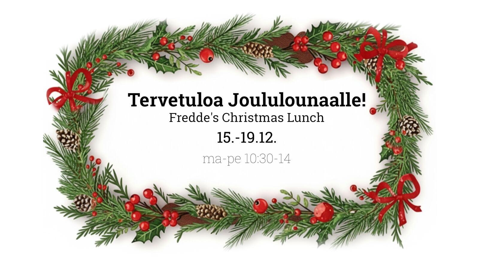 Fredde'sin suosittu perinteinen joululounas katettuna 15.-19.12. Tarjolla jouluinen lounasbuffet tai pöytiintarjoiltu kolmen ruokalajin Business lunch. Suosittelemme pöytävarausta!