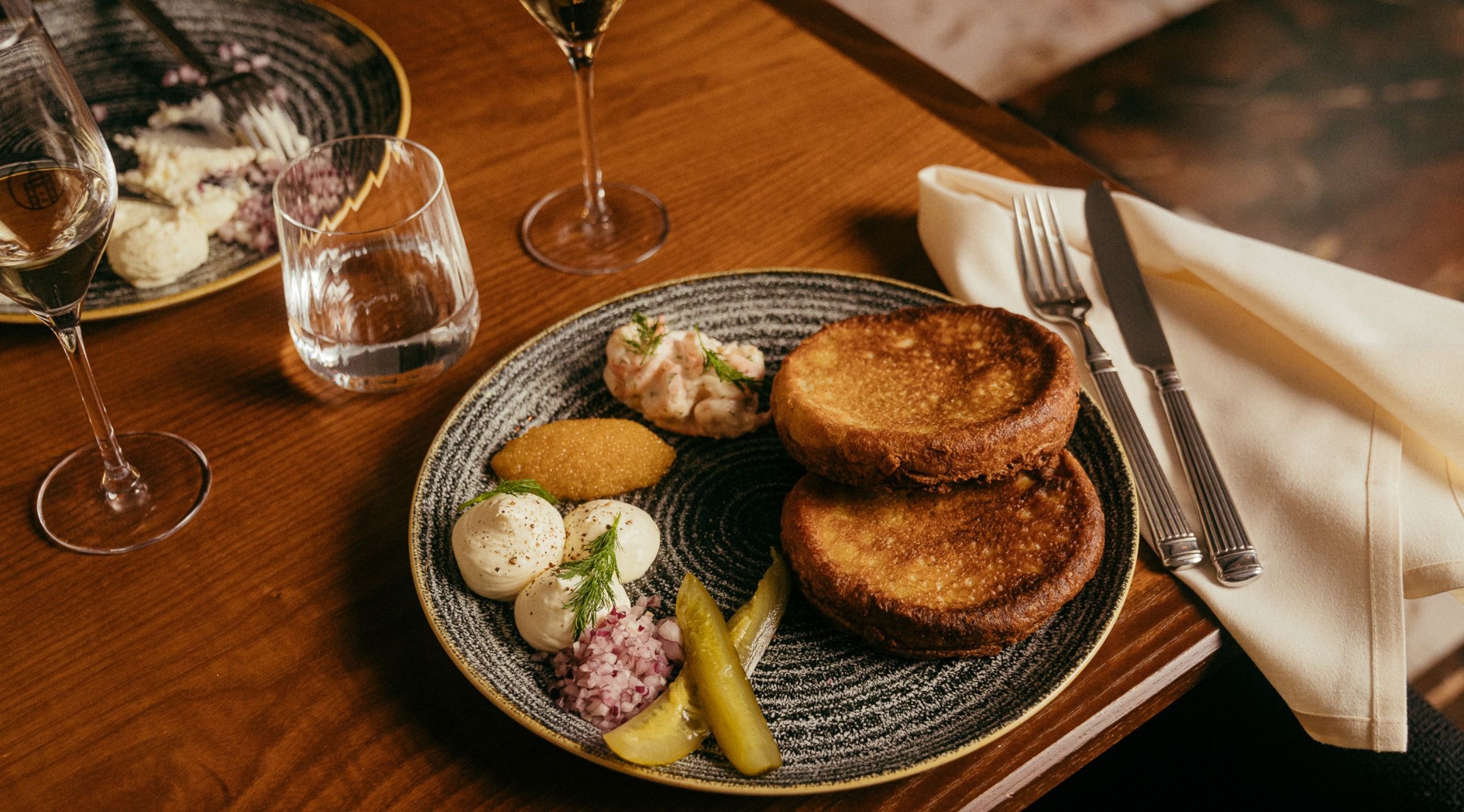 Kaikki Tornin blinit tarjoillaan smetanan, punasipulin, sekä tillin kanssa.