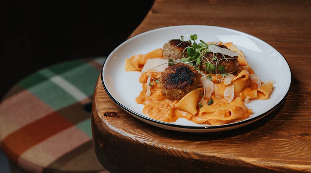 Pappardelle-pastaa, lihapullia, kermainen tomaattikastike, parmesanjuustoa