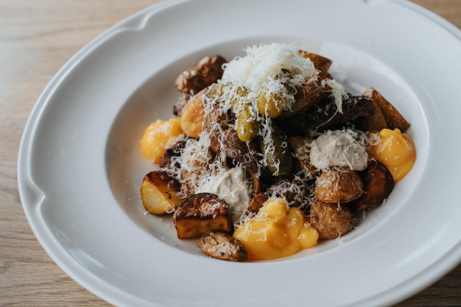 Sisäfilee, peruna, sipuli, paahdettu pippurimajoneesi, suolakurkku, keltuaisgeeli, parmesaani