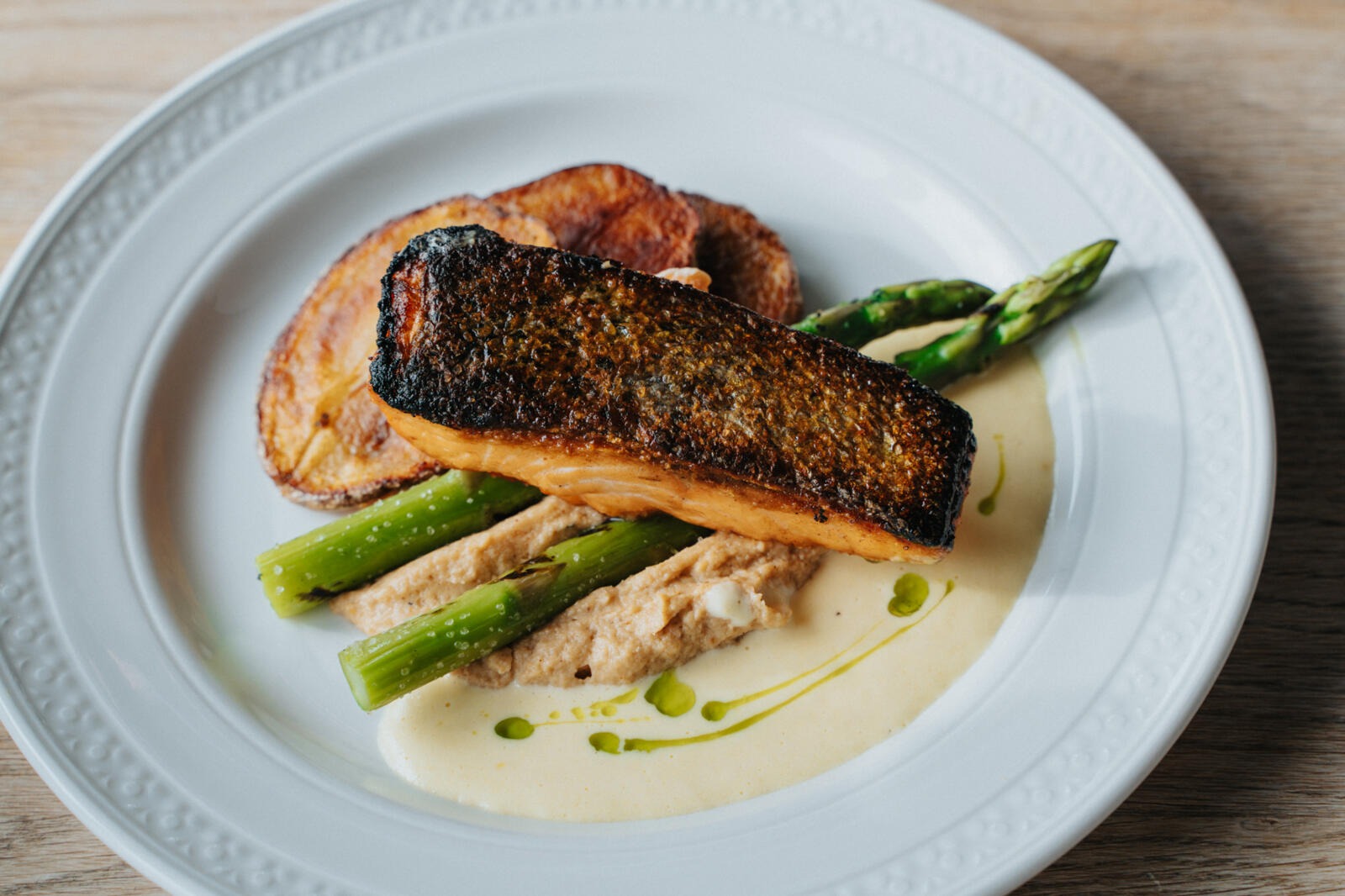 Peruna, kukkakaali, vihreä parsa, herne, omena-piparjuurivoikastike, tilliöljy