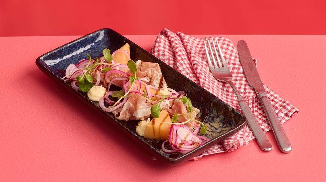 Ilmakuivattua kinkkua, raikasta melonia, pikkelöityä punasipulia, parmesaanimajoneesia ja balsamicosiirappia