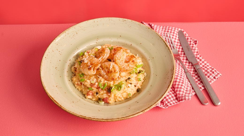 Paistettuja, marinoituja jättirapuja, kermaista äyriäisrisottoa, chilillä ja valkosipulilla marinoitua tomaattia, parmesaania, friteerattuja kapriksia ja kevätsipulia