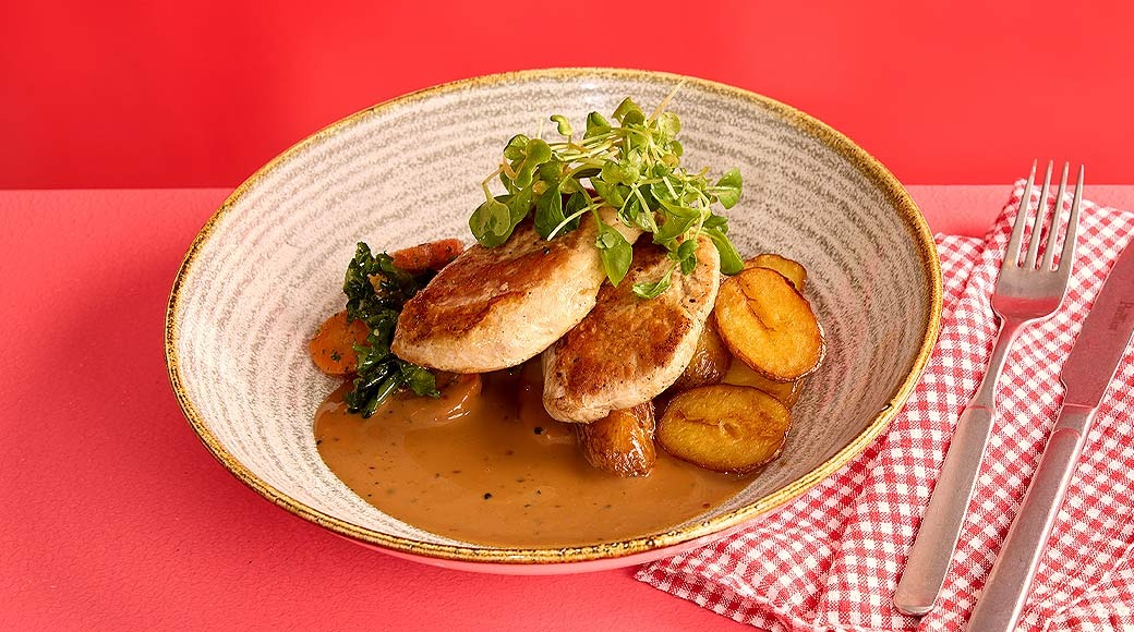Pariloituja porsaan sisäfileenoisetteja, Rosson täyteläistä pippurikermakastiketta, kauden kasviksia ja lohkoperunoita
