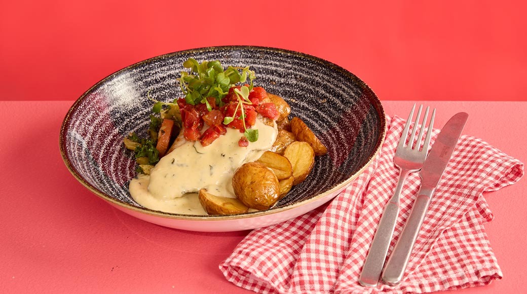 Asiakasomistajahinta: 21,90 €Grillattua broilerinfileetä, bearnaisekastiketta, chilillä ja valkosipulilla marinoitua tomaattia, kauden kasviksia ja lohkoperunoita