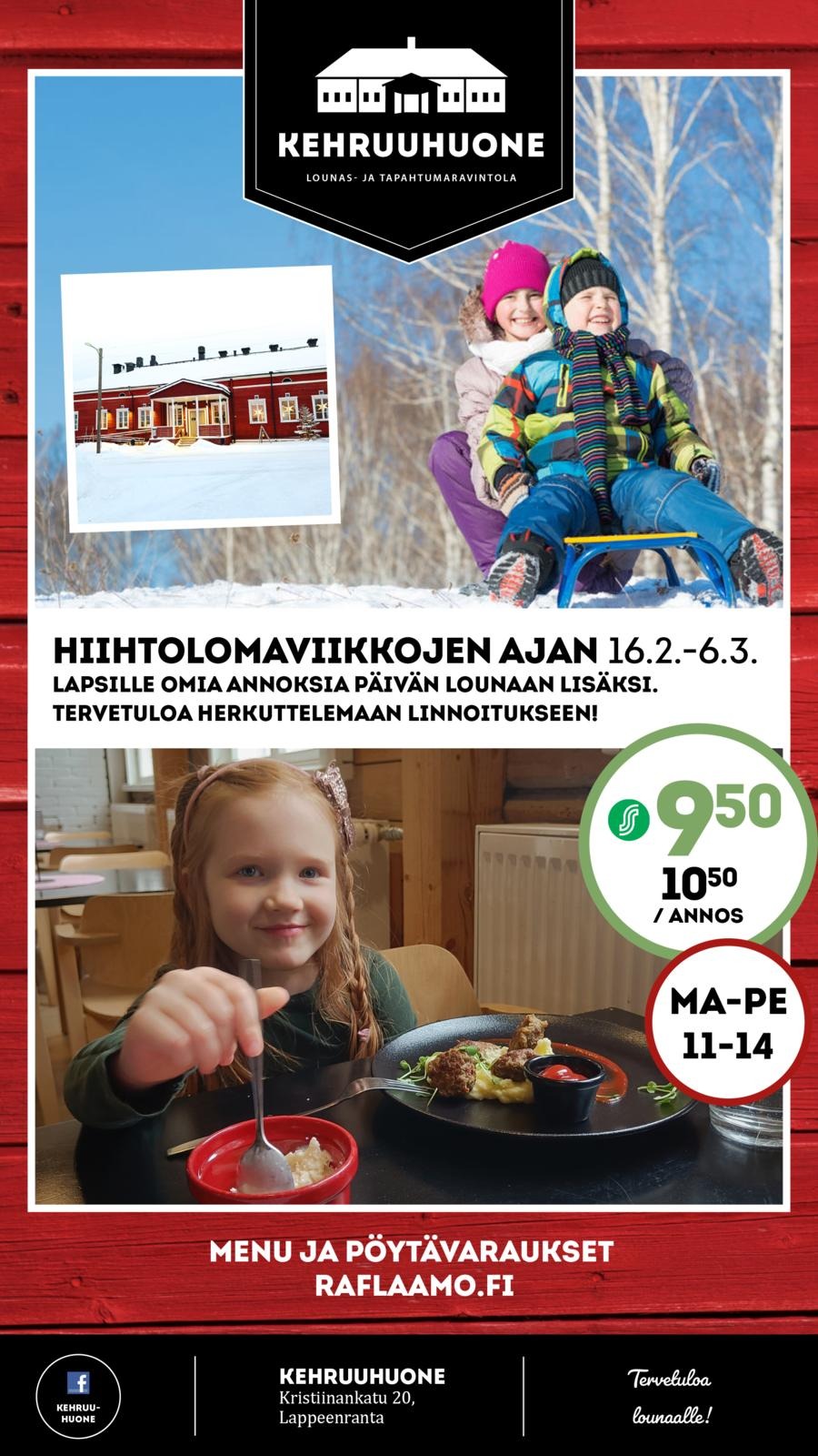 Tervetuloa lounaalle koko perheen voimin Kehruuhuoneelle hiihtolomaviikkojen ohjelman lomassa.