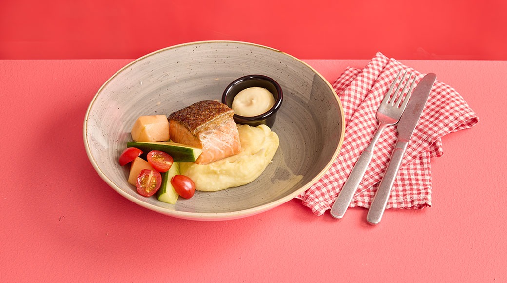 Paahdettua lohta, perunamuusia, kurkkutikkuja, melonia ja kirsikkatomaattia sekä dippikastike valintasi mukaan