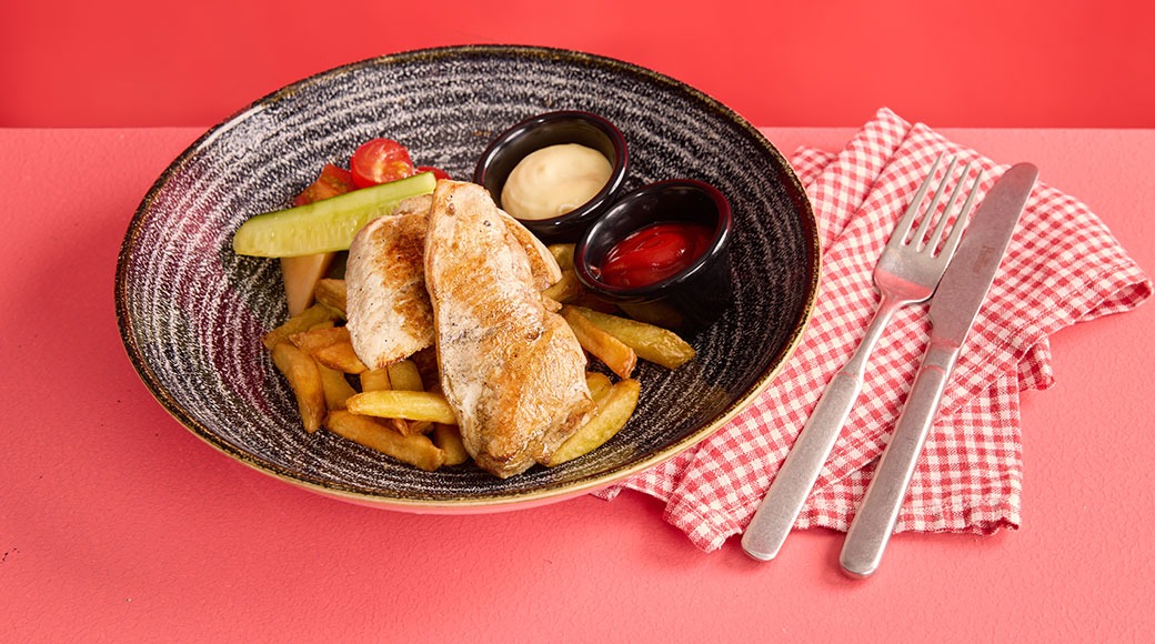 Broilerinfileetä, rapeita ranskalaisia perunoita, kurkkutikkuja, melonia ja kirsikkatomaattia sekä dippikastike valintasi mukaan