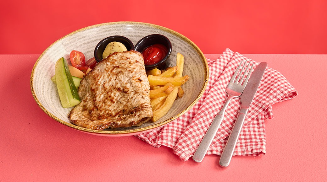 Porsaan lehtipihvi, italialaista maustevoita, rapeita ranskalaisia perunoita, kurkkutikkuja, melonia ja kirsikkatomaattia