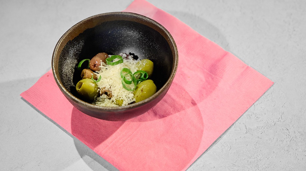 Marinoituja oliiveja, parmesaania
