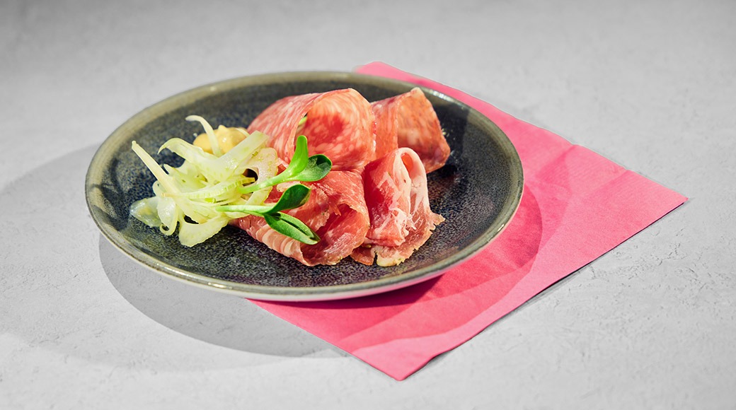 Copakinkkua, salamia, antipastokippo, valkosipulileipää, comté-juustoa, granaattiomenahilloketta, piripirimajoneesia, pikkelöityä fenkolia, vadelmia