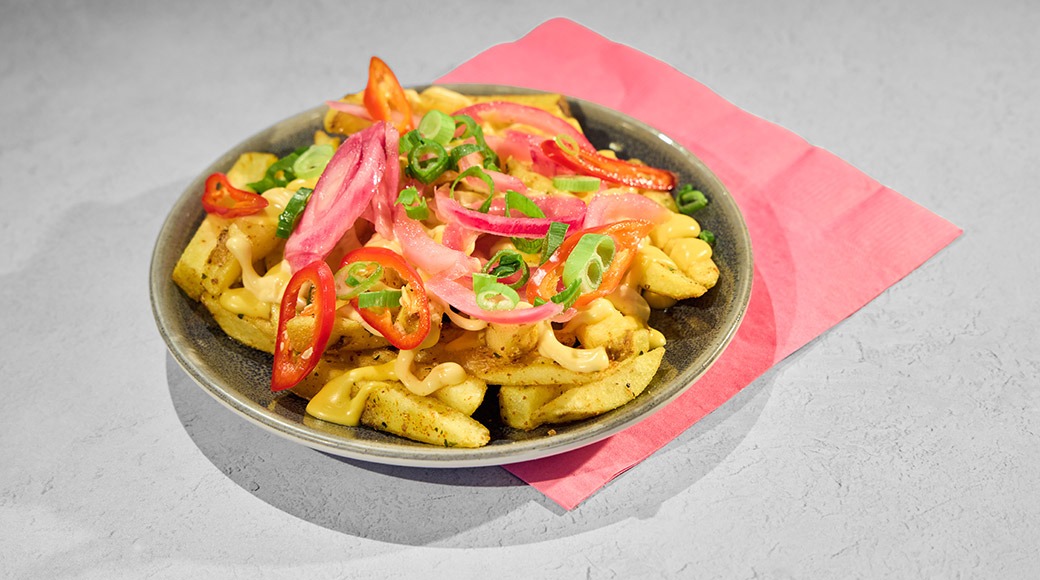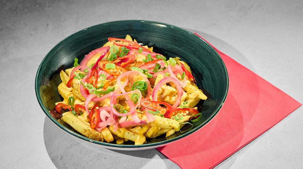 Isoon nälkään tai jaettavaksi! Cheddarjuustokastiketta, piripirimajoneesia, pikkelöityä punasipulia, pikkelöityä chiliä