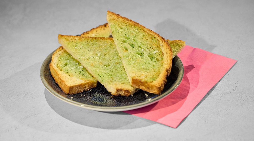 Paahdettua hapanjuurileipää, yrttivalkosipuliöljyä