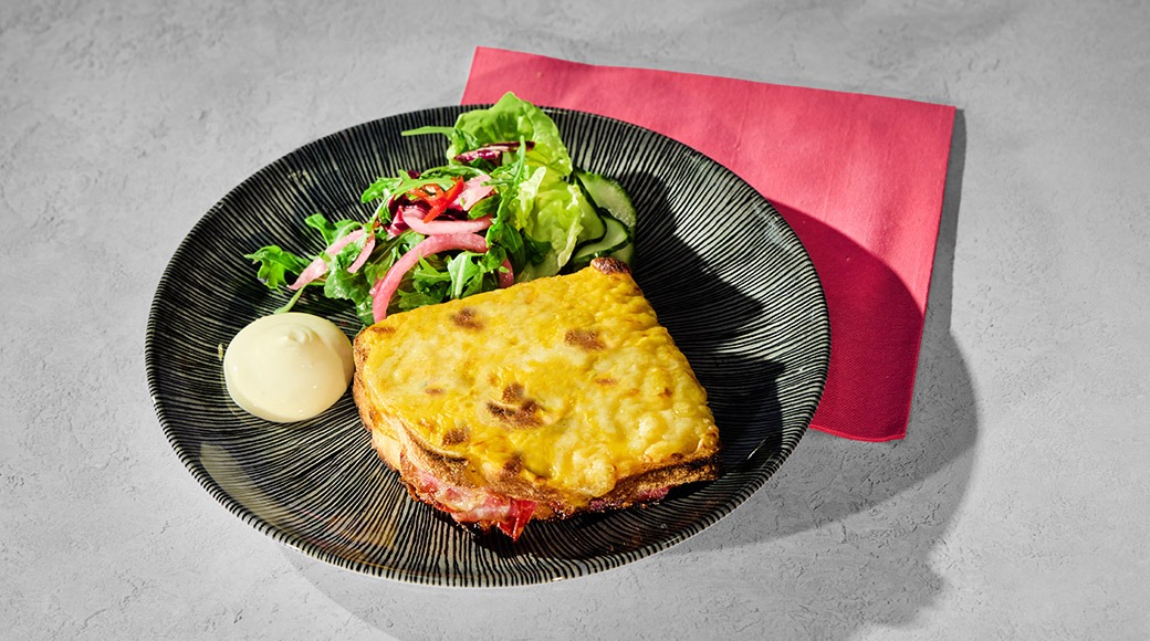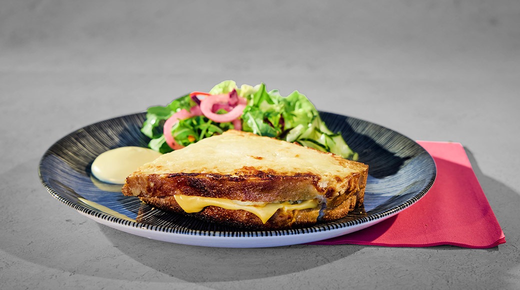 Asiakasomistajahinta: 12,50 €Levain-leipää, Aura-juustoa, cheddarkastiketta, parmesaanicremeä ja parmesaania. Lisäksi sydänsalaattia, rucolaa, kaalia, mummonkurkkua, pikkelöityä punasipulia ja chiliä, limemajoneesia.