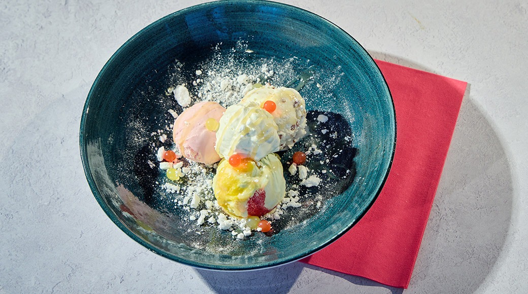 Asiakasomistajahinta: 8,20 €Mansikka-, tuttifrutti-, ja Daim-jäätelöä, kookoskinuskia, kermavaahtoa, sitruuna- ja mansikkahelmiä