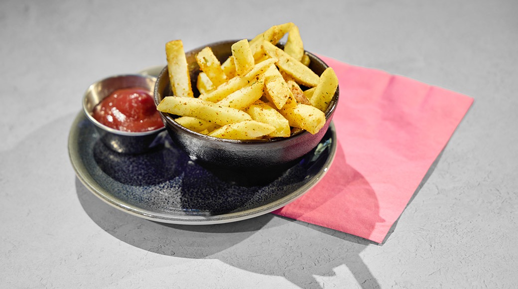Paneroitua kananpojan sisäfilettä, burgersämpylä, limemajoneesia, sydänsalaattia, rucolaa, kaalia, teriyakikastiketta, pikkelöityä punasipulia ja chiliä, ranskalaisia, ketsuppia