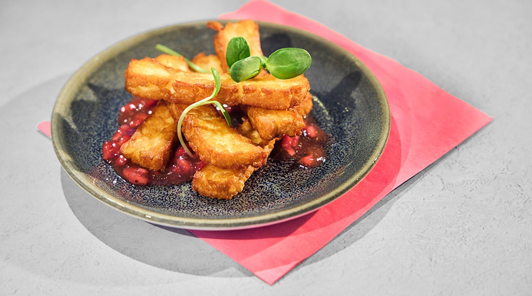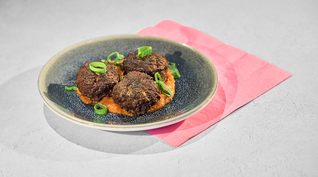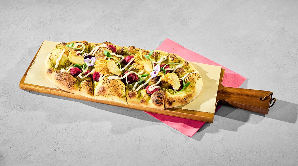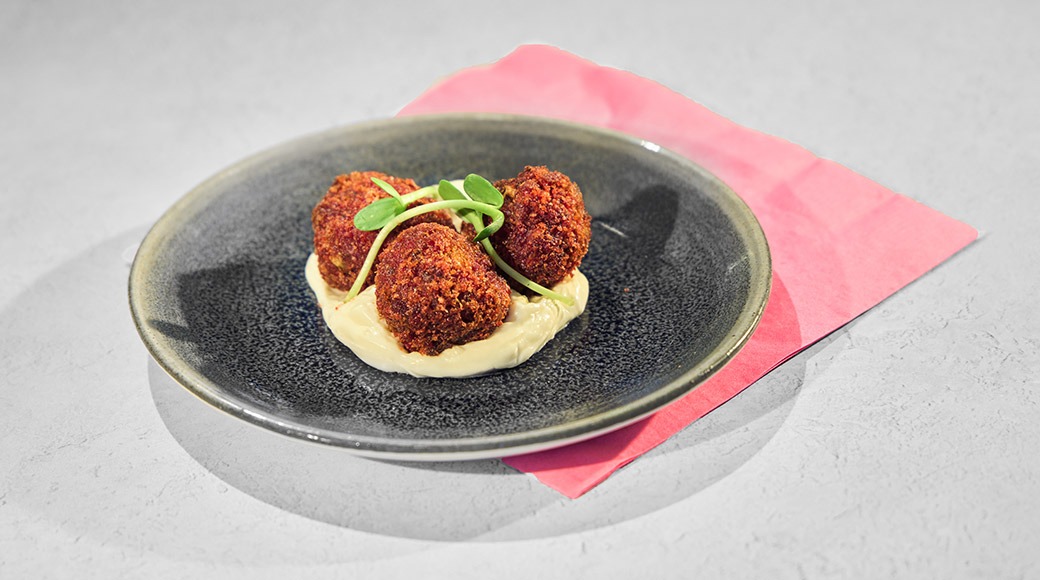 Punajuuripyöryköitä, rapeaa artisokkaa, pestoa, charvecremeä