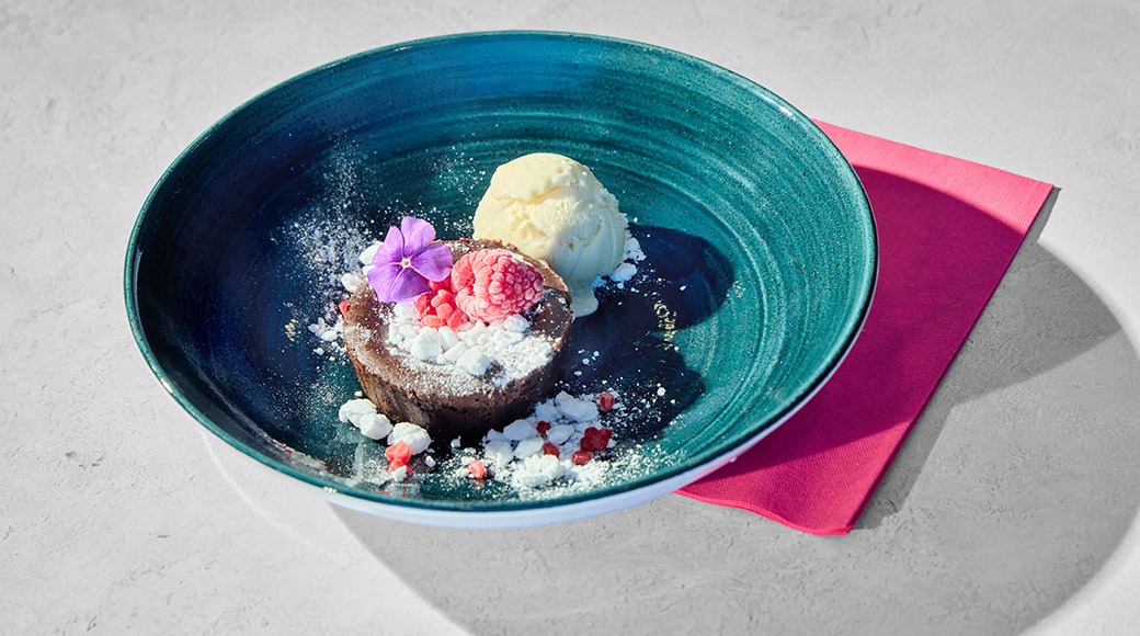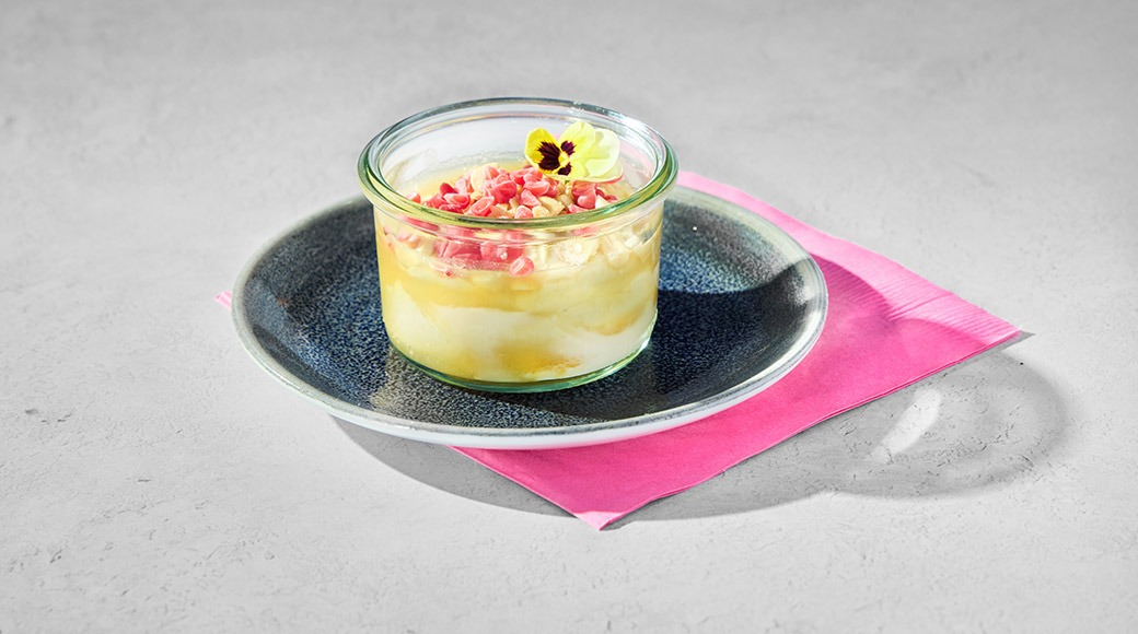 Mango-passionmoussea, keksiä, vadelmaa