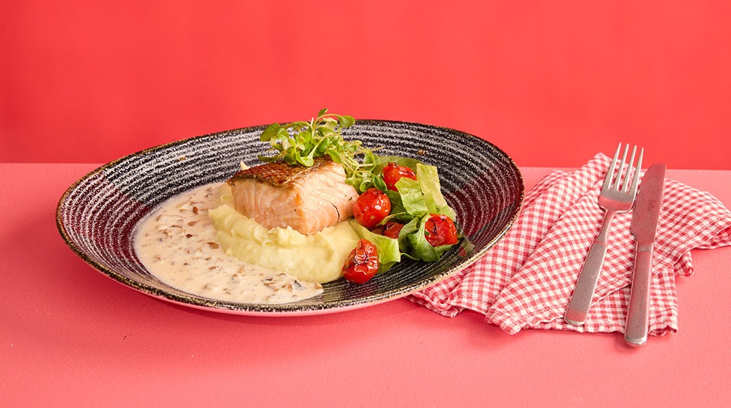 Paahdettua lohta, sienikastiketta, romainesalaattia, pikkelöityjä kirsikkatomaatteja, tuoretta pinaattia ja perunamuusia