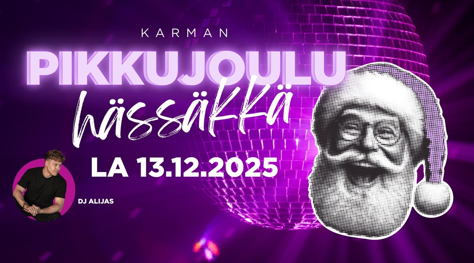 Karman Pikkujouluhässäkkä tarjoaa loistavat puitteet pikkujoulujen juhlintaan, olitpa sitten liikkeellä työporukalla, kavereiden kanssa tai muuten vain tanssijalkaa vipattaa. Musiikista vastaa DJ Alijas.