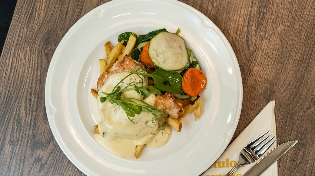 Pariloitua broileria, bearnaisekastiketta, ranskanperunoita, raikkaita kasviksia ja herneenversoa