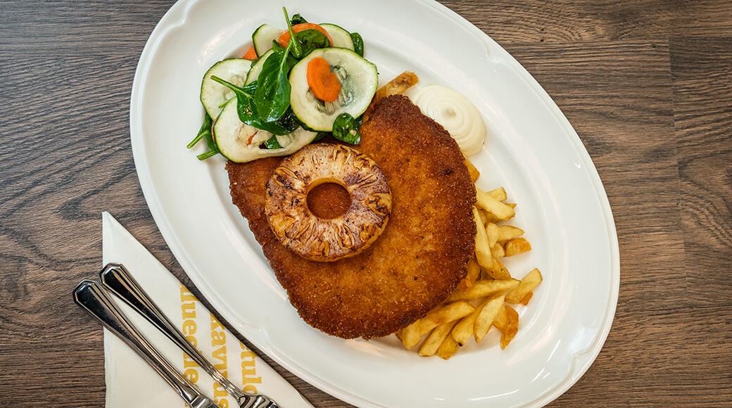 Panerad vegetariska biff, grillad ananas, pommes frites, marinerade grönsaker och aioli.