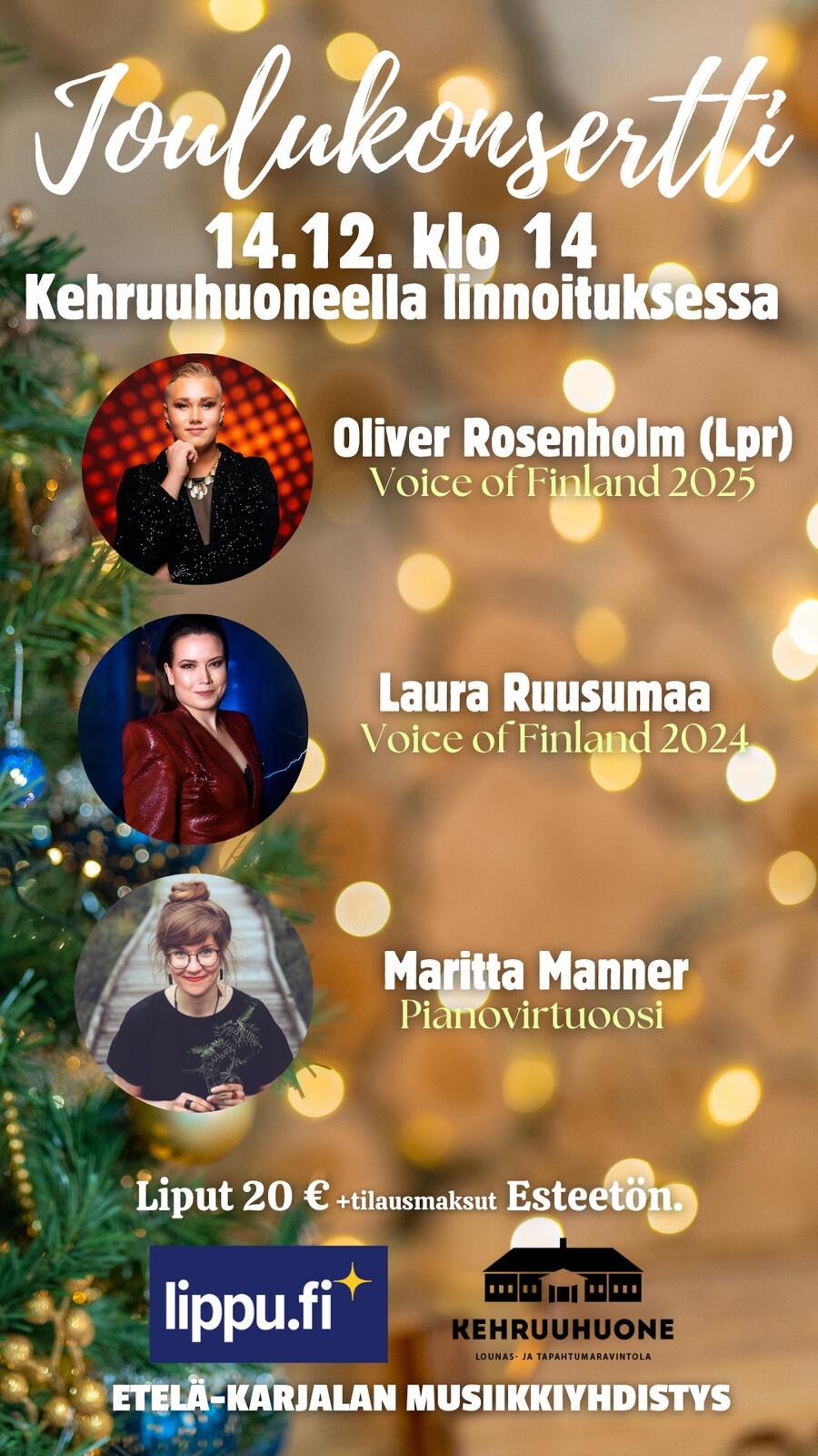 Viihteellinen sekä perinteinen joulukonsertti linnoituksen joulumarkkinoiden yhteydessä Kehruuhuoneella. Konsertissa esiintyvät viimeisimmät Voice of Finland -voittajat Oliver Rosenholm (Lpr) sekä Laura Ruusumaa. Pianistina taituroi Maritta Manner. Konsertin kesto n. 1,5 h sisältäen väliajan.